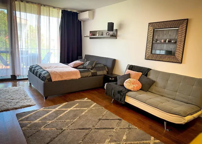 Yacht Club Art Apartman A20 Balatonlelle o powierzchni 43 m^2 z widokiem na ogród zapewnia Gościom dostęp do prywatnego obszaru plaży. Balaton jest 4 km od obiektu, podczas gdy Balatonlelle Felso Vasutallomas znajduje się około 10 min jazdy autem od tego apartamentu.